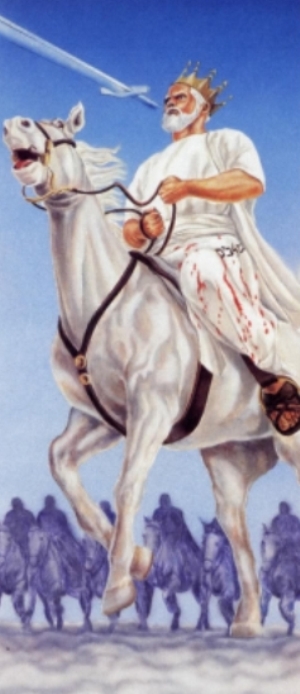 現在,約翰從天上看見一匹白馬。騎手以正義之名作戰。他身穿浸滿鮮血的長袍,名叫「上帝之道」。軍隊穿著白衣跟隨他。