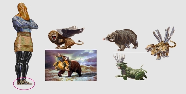 但以理书 7:2 但 以 理 说 : 我 夜 里 见 异 象 , 看 见 天 的 四 风 陡 起 , 刮 在 大 海 之 上 。3 有 四 个 大 兽 从 海 中 上 来 , 形 状 各 有 不 同 :4 头 一 个 像 狮 子 , 有 鹰 的 翅 膀 ; 我 正 观 看 的 时 候 , 兽 的 翅 膀 被 拔 去 , 兽 从 地 上 得 立 起 来 , 用 两 脚 站 立 , 像 人 一 样 , 又 得 了 人 心 。5 又 有 一 兽 如 熊 , 就 是 第 二 兽 , 旁 跨 而 坐 , 口 齿 内 衔 着 三 根 肋 骨 。 有 吩 咐 这 兽 的 说 : 起 来 吞 吃 多 肉 。6 此 後 我 观 看 , 又 有 一 兽 如 豹 , 背 上 有 鸟 的 四 个 翅 膀 ; 这 兽 有 四 个 头 , 又 得 了 权 柄 。7 其 後 我 在 夜 间 的 异 象 中 观 看 , 见 第 四 兽 甚 是 可 怕 , 极 其 强 壮 , 大 有 力 量 , 有 大 铁 牙 , 吞 吃 嚼 碎 , 所 剩 下 的 用 脚 践 踏 。 这 兽 与 前 三 兽 大 不 相 同 , 头 有 十 角 。